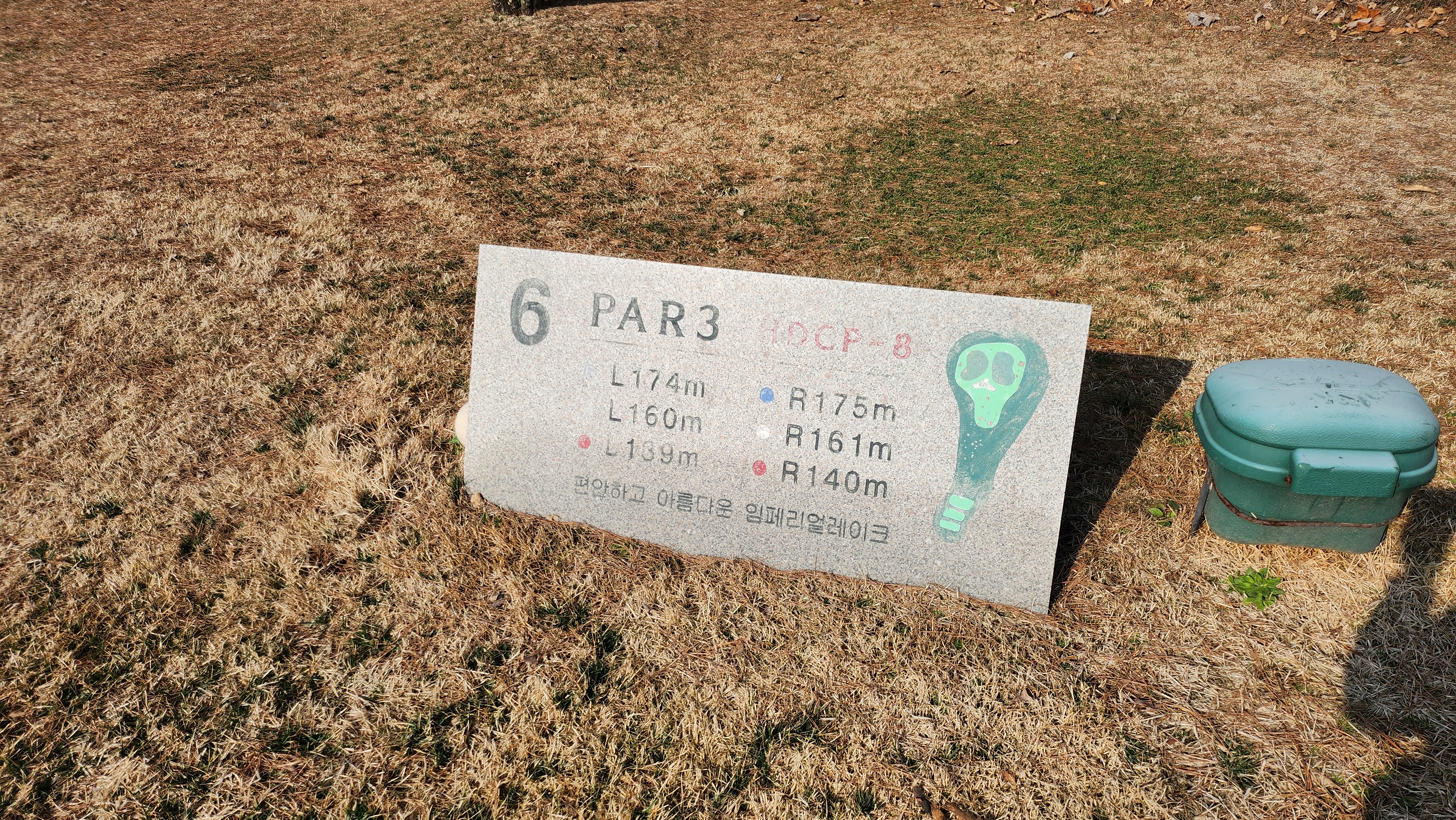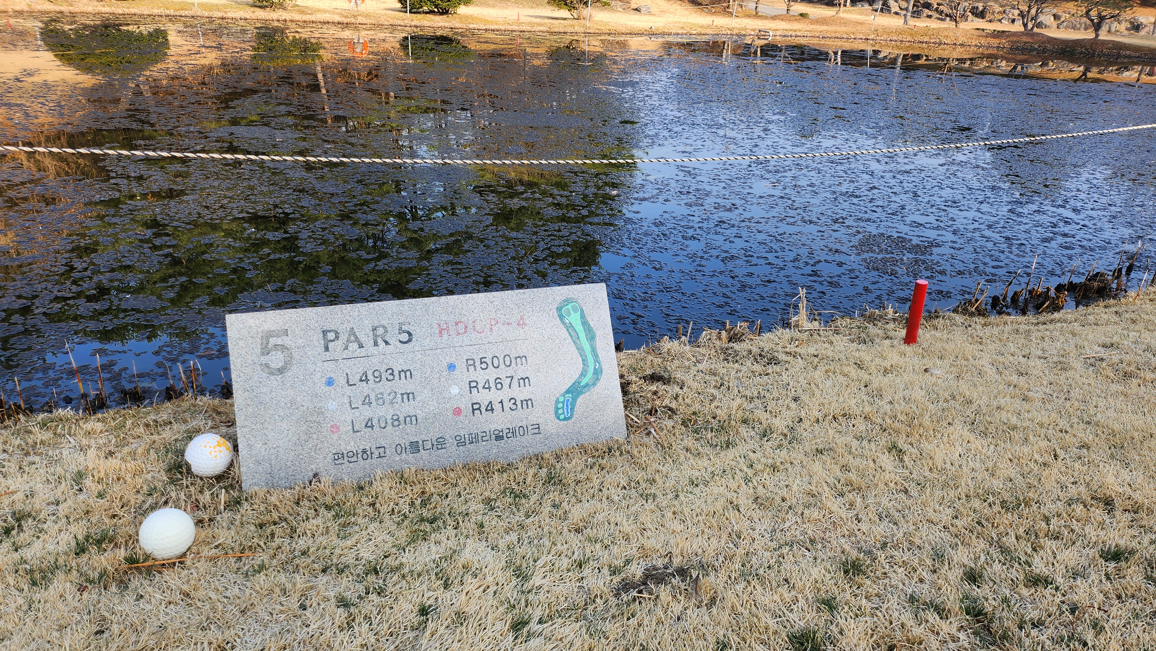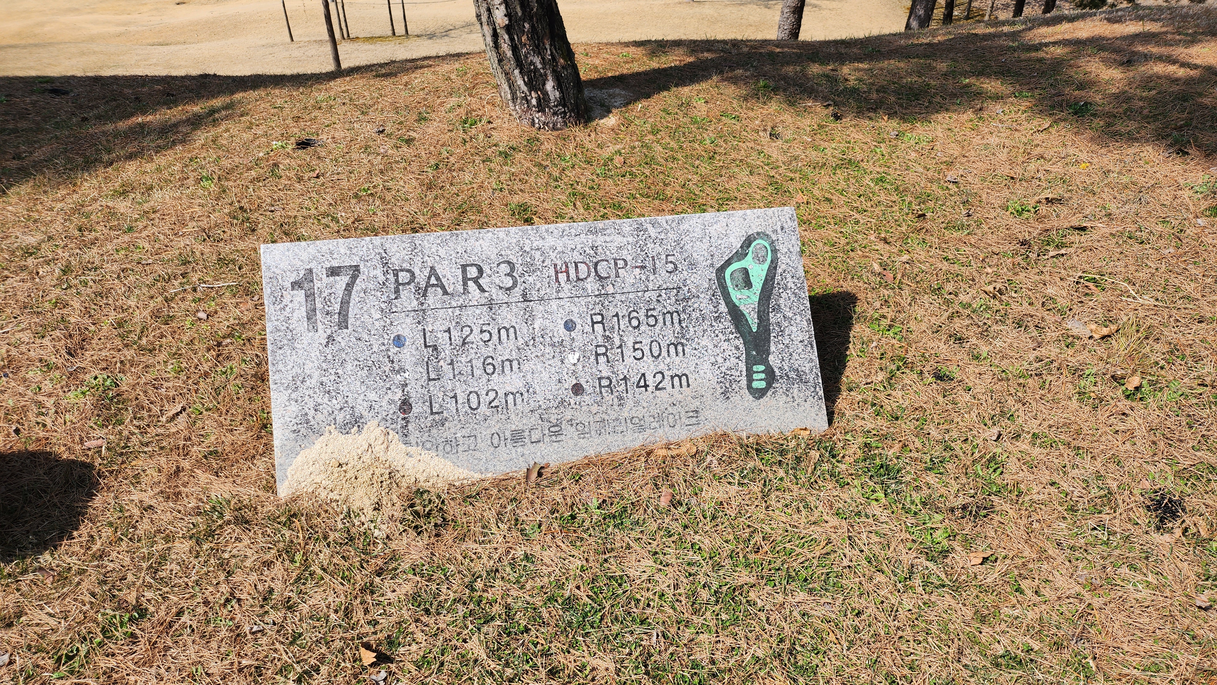 홀에 대한 정보와 거리를 알려주는 안내석과 오늘의 핀 위치를 표시해 둔 안내판이 친절해 보입니다.