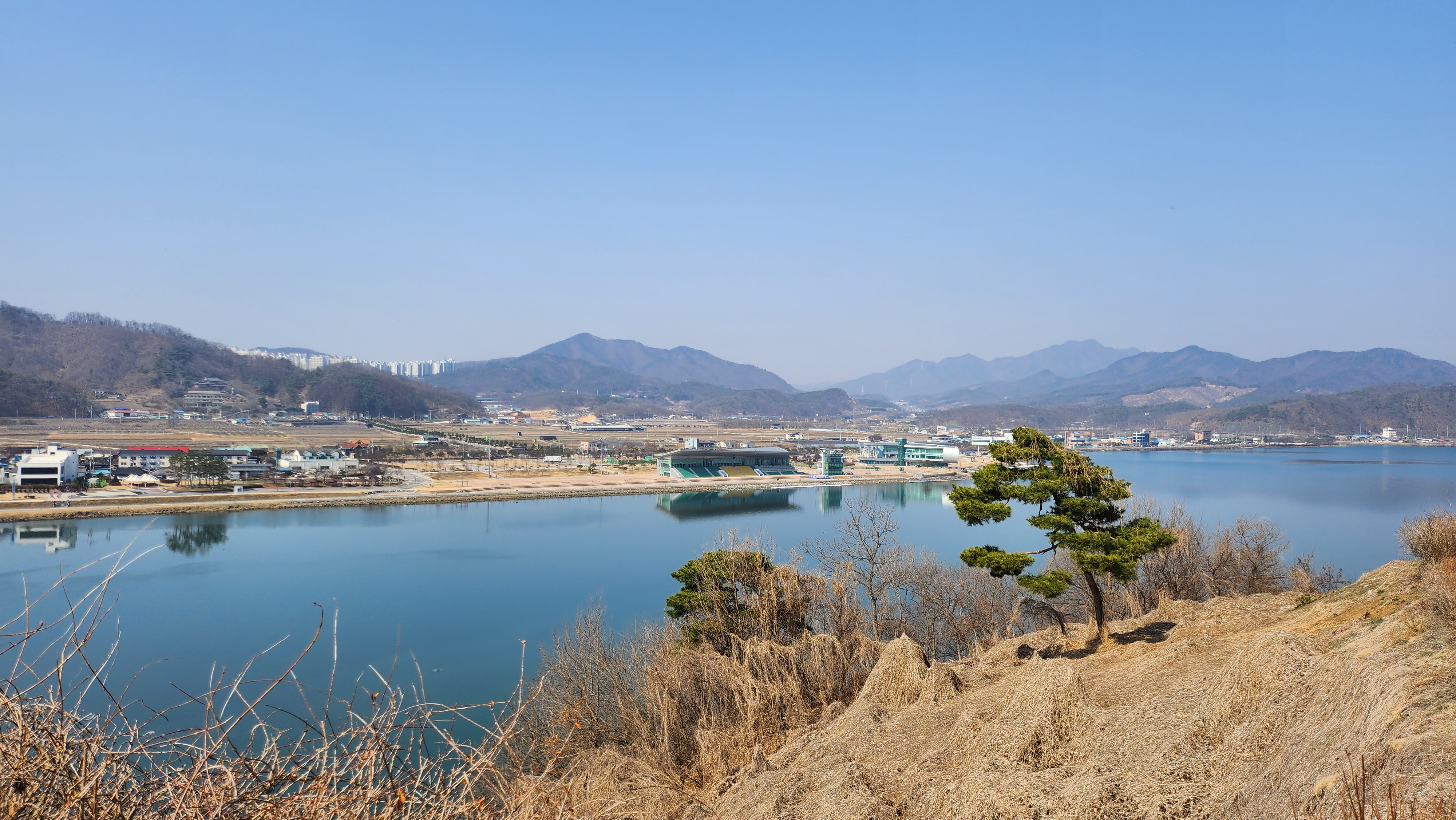 호수와 소나무가 어우러져 조경이 아름답고 편안합니다.