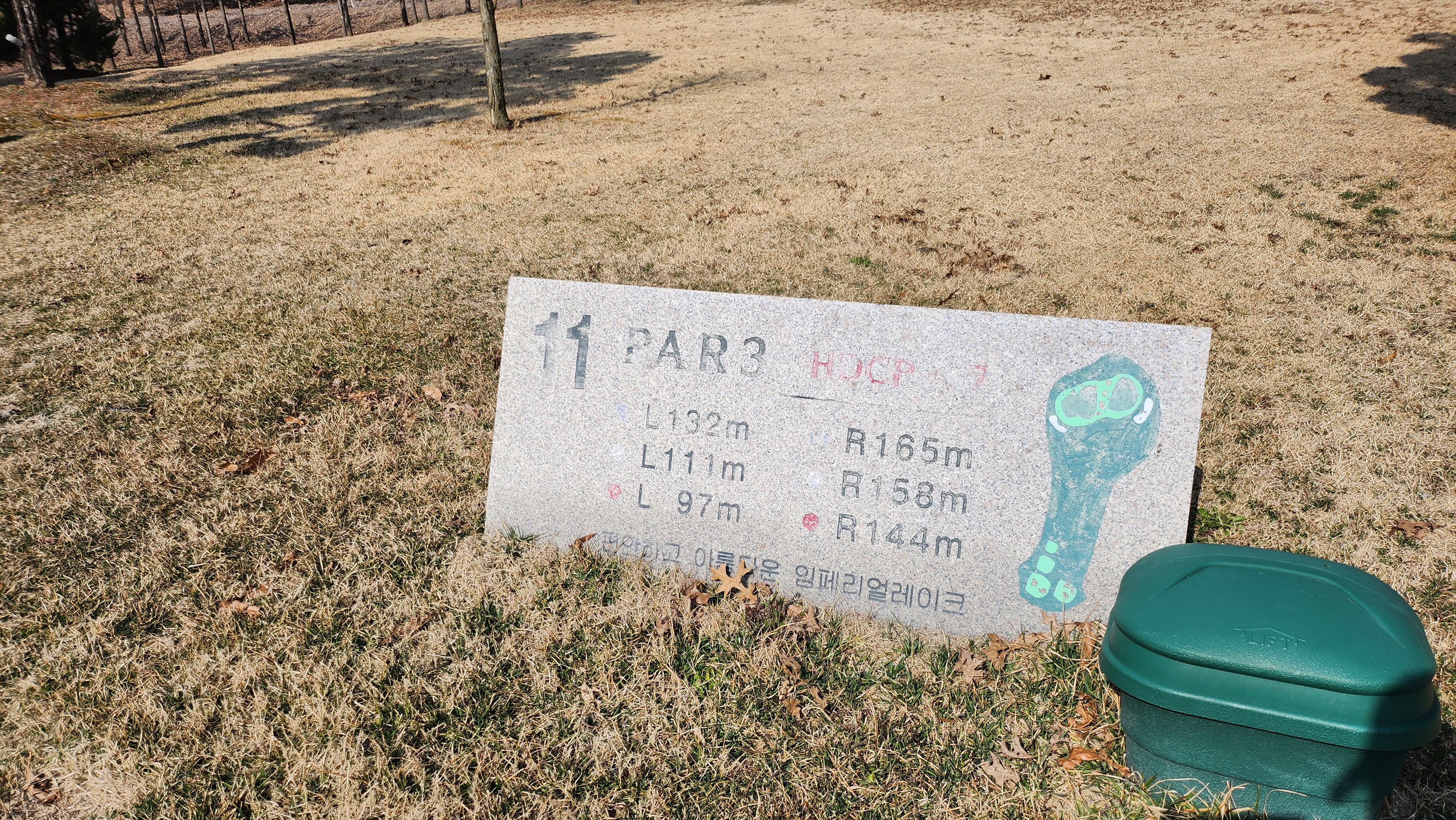 홀에 대한 정보와 거리를 알려주는 안내석과 오늘의 핀 위치를 표시해 둔 안내판이 친절해 보입니다.