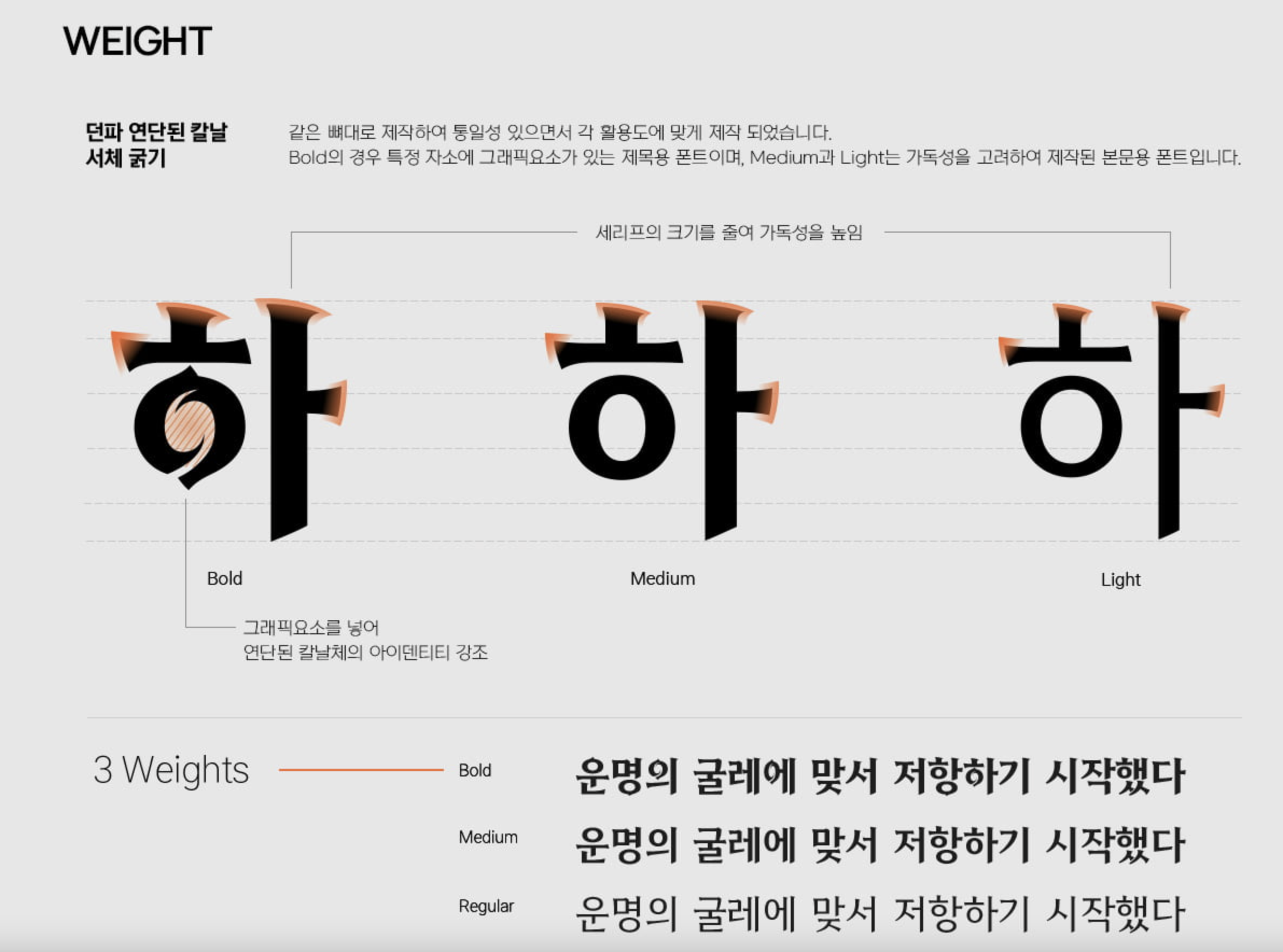 LEVEL UP의 첫 단계로 게임에서 경험했던 느낌을 서체에 담아 표현했습니다. 서체의 기능적인 부분 외에도 즐거운 경험들을 전달하고자 하는 또 다른 도전의 시작입니다.