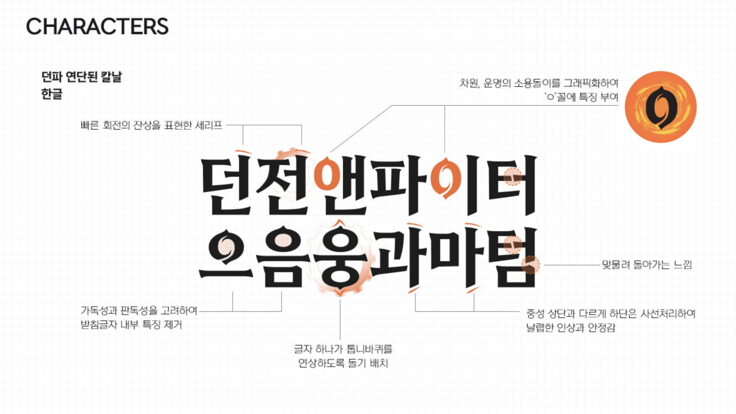 또한, 그래픽요소가 들어간 자소와 세리프를 통하여 던전앤파이터만의 통쾌한 타격감과 액션감을 함꼐 느낄 수 있습니다.