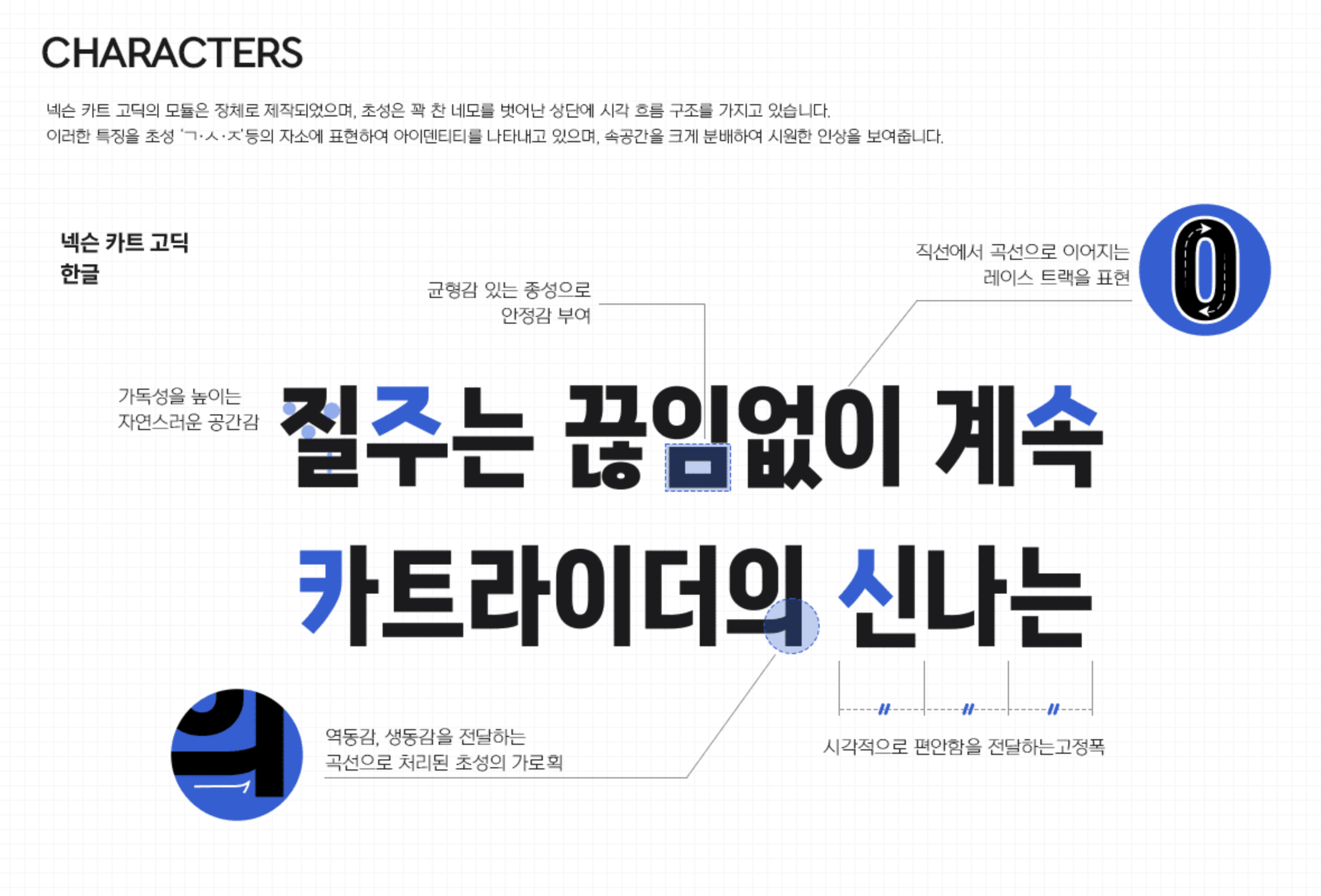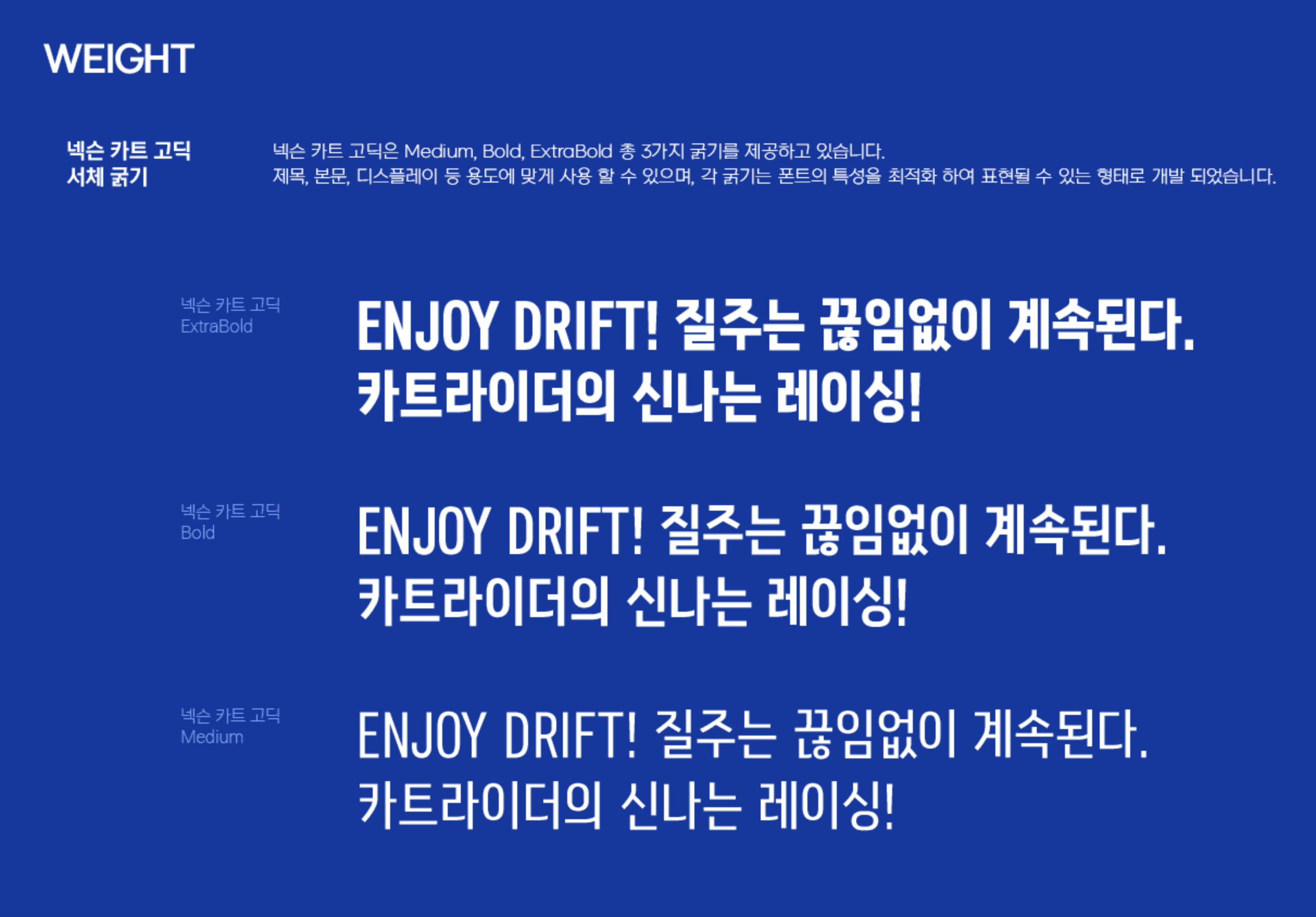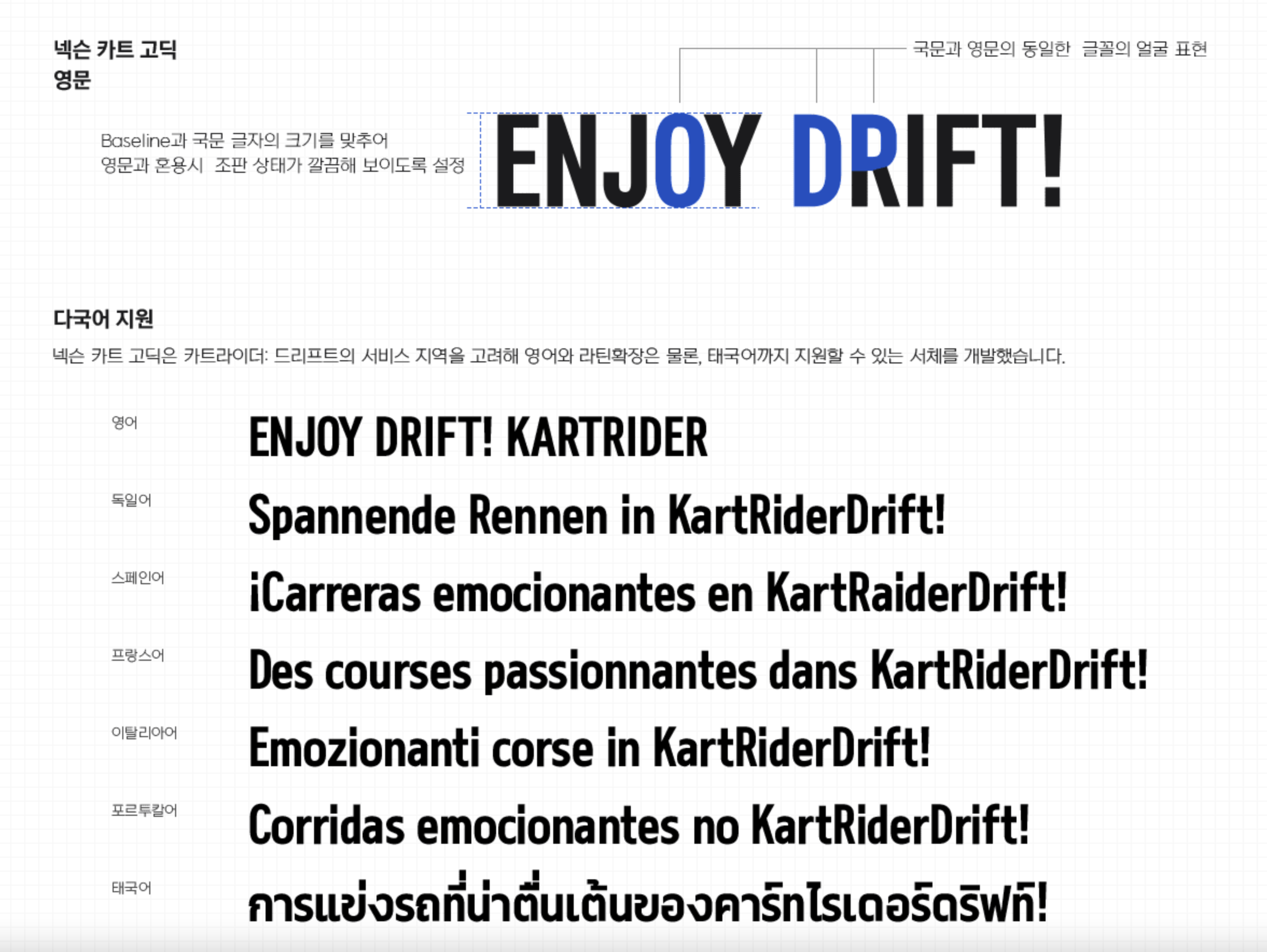 대표적인 레이싱 게임인 카트라이더: 드리프트는 사용자의 폭이 넓고 다양하여 친근함, 밝고 경쾌한 게임의 특성, 드리프트의 특장점을 서체의 형태적 느낌으로 표현하고자 하였습니다.