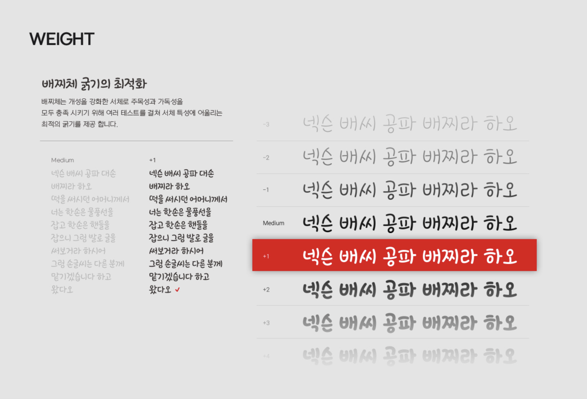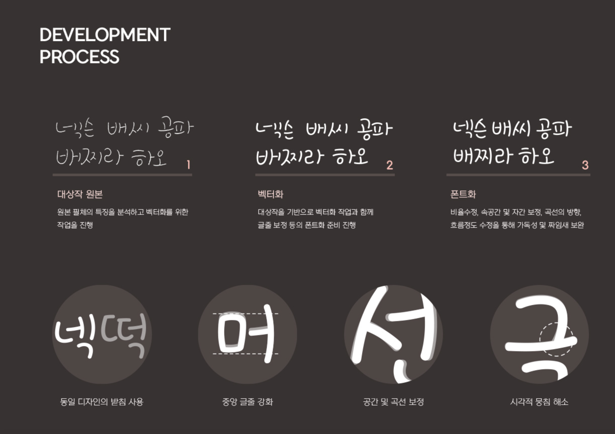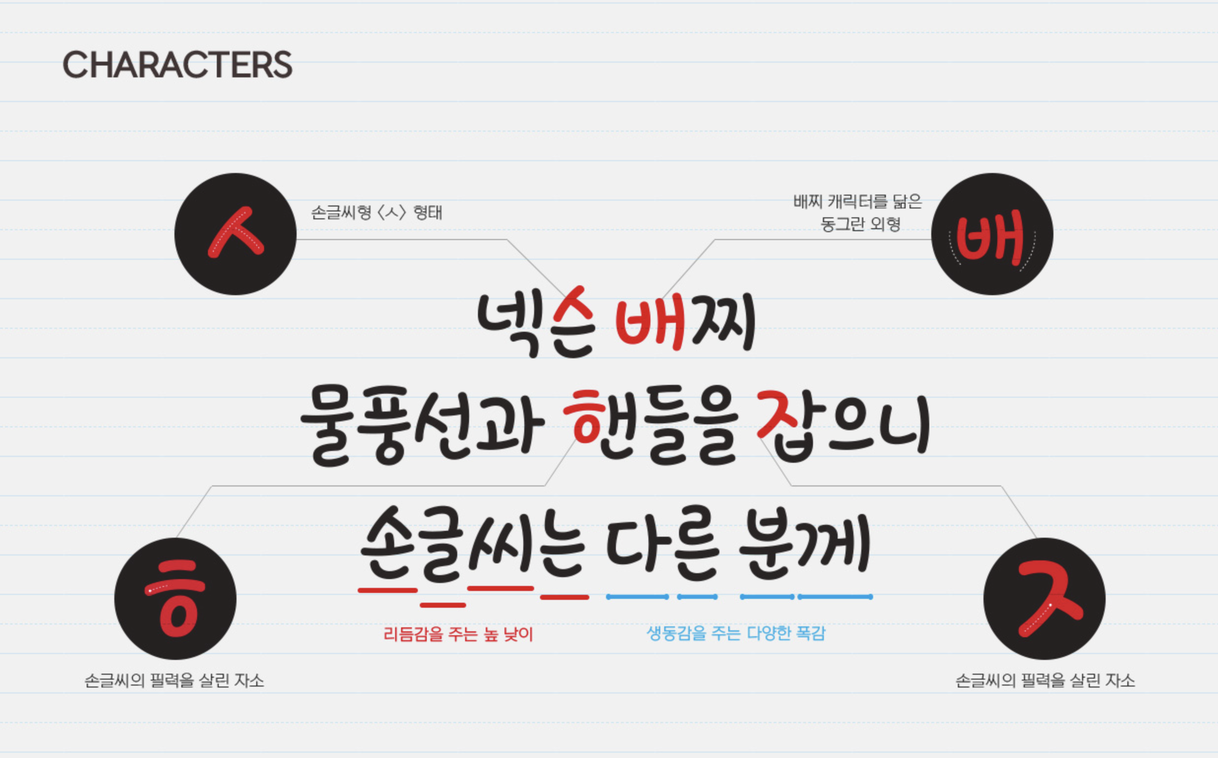 LEVEL UP의 첫 단계로 게임에서 경험했던 느낌을 서체에 담아 표현했습니다. 서체의 기능적인 부분 외에도 즐거운 경험들을 전달하고자 하는 또 다른 도전의 시작입니다.