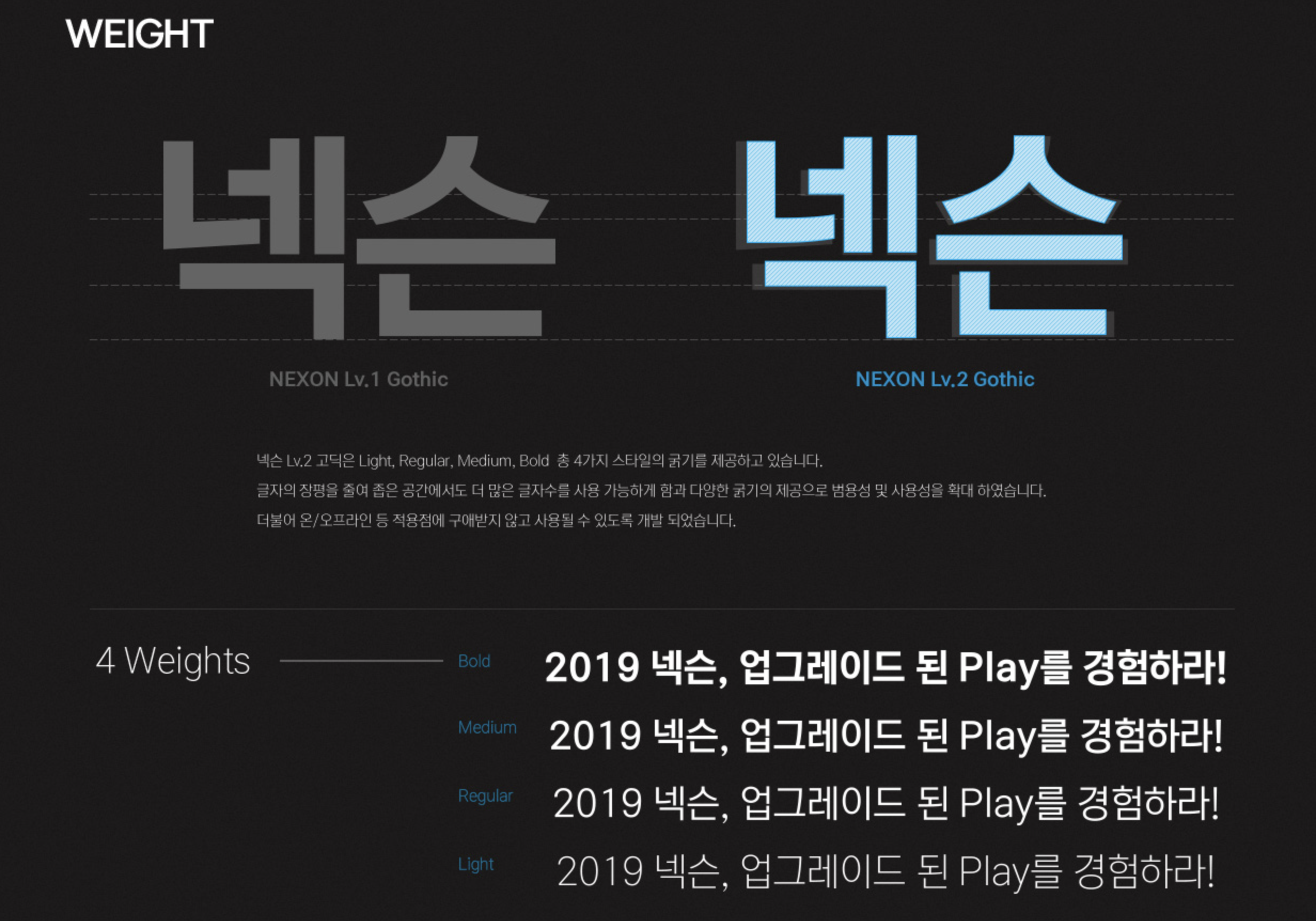 LEVEL UP의 첫 단계로 게임에서 경험했던 느낌을 서체에 담아 표현했습니다. 서체의 기능적인 부분 외에도 즐거운 경험들을 전달하고자 하는 또 다른 도전의 시작입니다.
