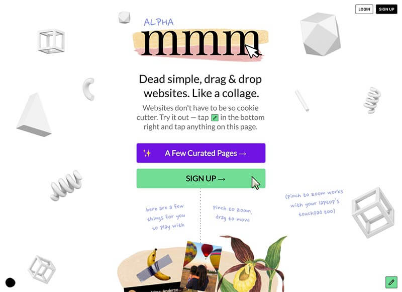 드래그 앤 드롭으로 이미지를 콜라주하여 웹 사이트를 만들 수 있는 간단한 도구. 오른쪽 하단의 아이콘을 클릭하면 현재 페이지를 편집해 볼 수 있습니다.