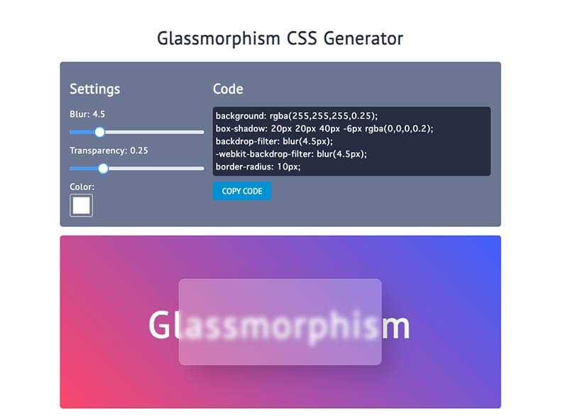 글라스 모드 필터 효과를 쉽게 만들 수 있는 알고리즘 CSS입니다. 클릭 하나로 완성 된 CSS 코드를 복사 - 붙여 넣기 할 수 있습니다.