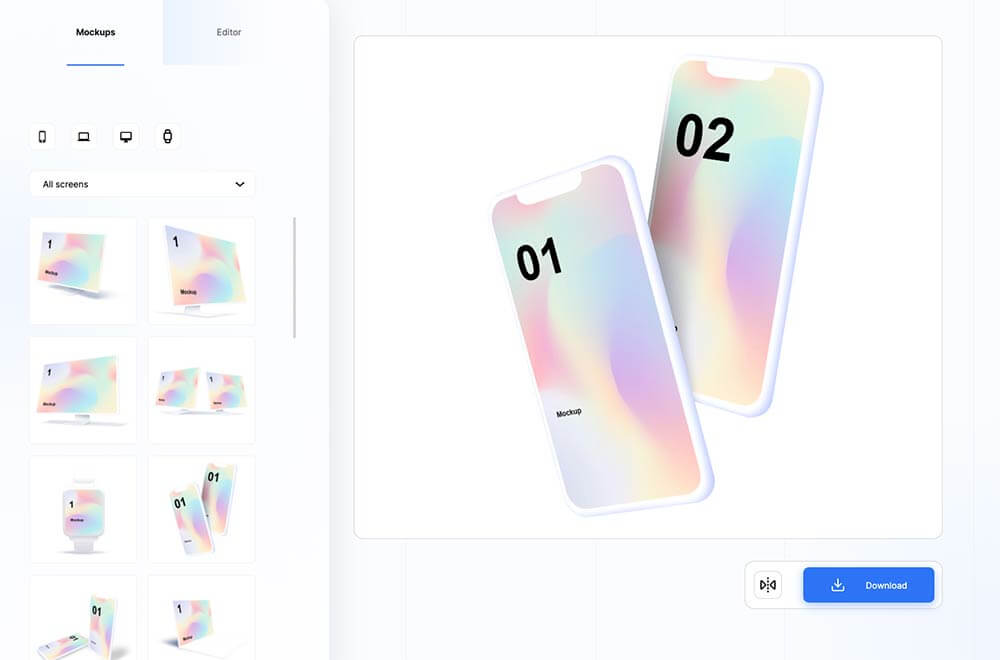 데스크톱과 태블릿, 스마트폰을 사용한 3D 목업을 온라인에서 무료로 만들 수 있습니다.