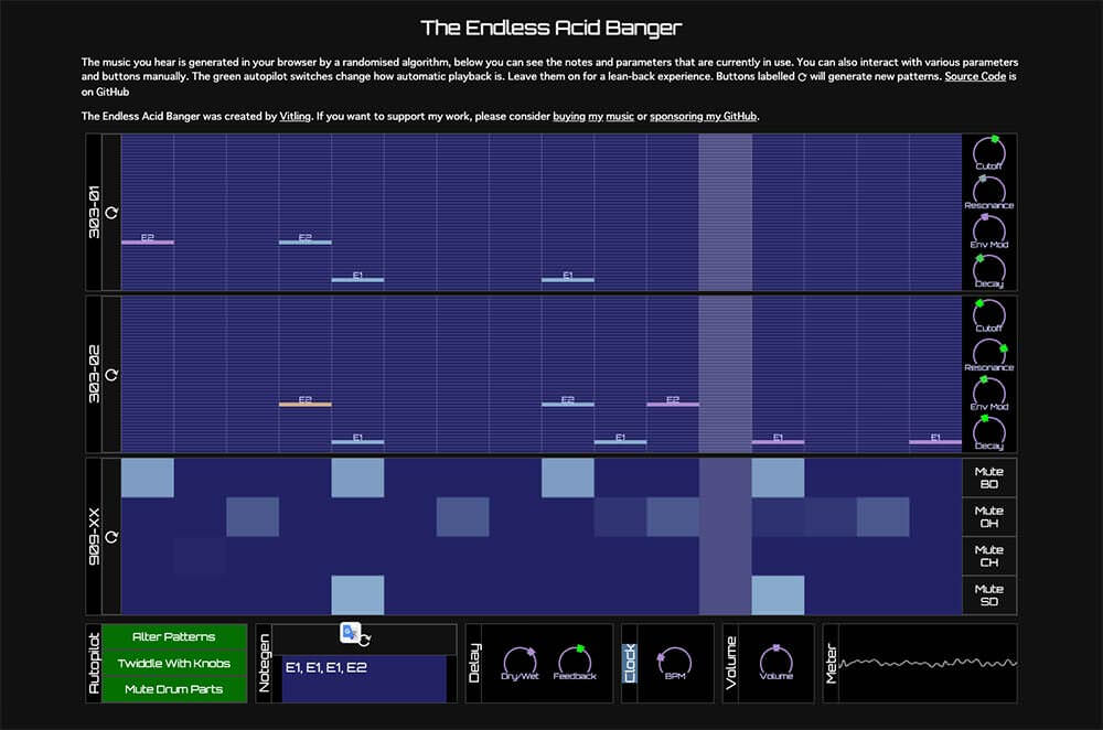알고리즘에 의해 랜덤한 소리를 자동으로 브라우저에서 생성하는 도구입니다. BPM이나 멜로디 등 세세한 설정도 가능합니다.
