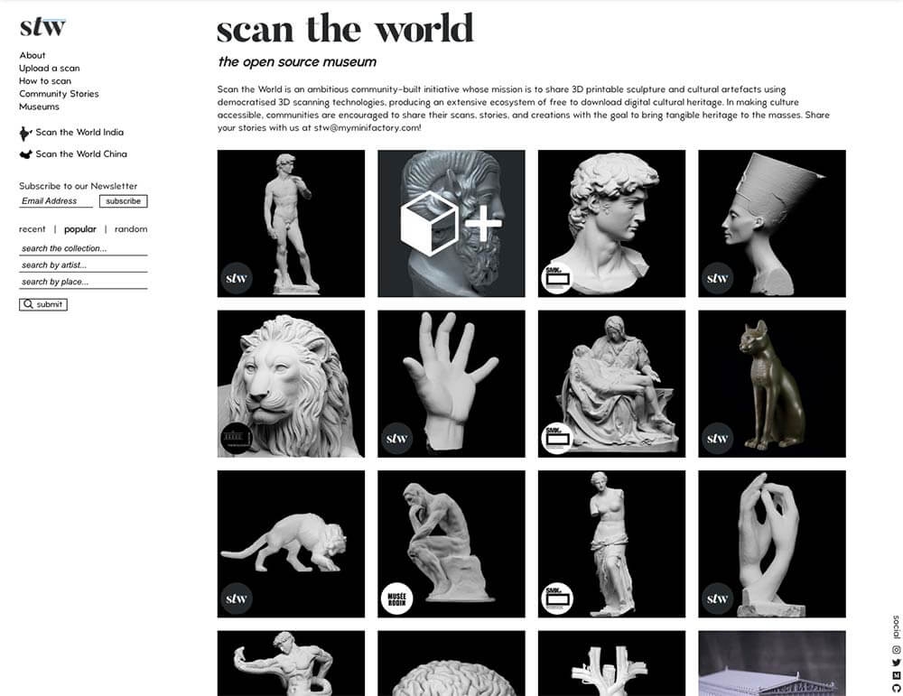피라미드와 다비드 상 등 세계의 모든 귀중한 조각과 문화 공예품을 그대로 3D 프린트할 수 있도록 데이터를 무료로 제공하는 사이트입니다. 사용자가 실제로 만든 작품도 볼 수 있습니다.