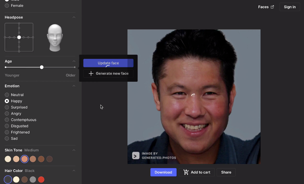 설정 항목을 클릭하여 가공의 인물 표정을 만들 수 있는 툴입니다. 미래의 모습이나 성형한 모습을 시뮬레이션 해 볼 수도 있겠네요.