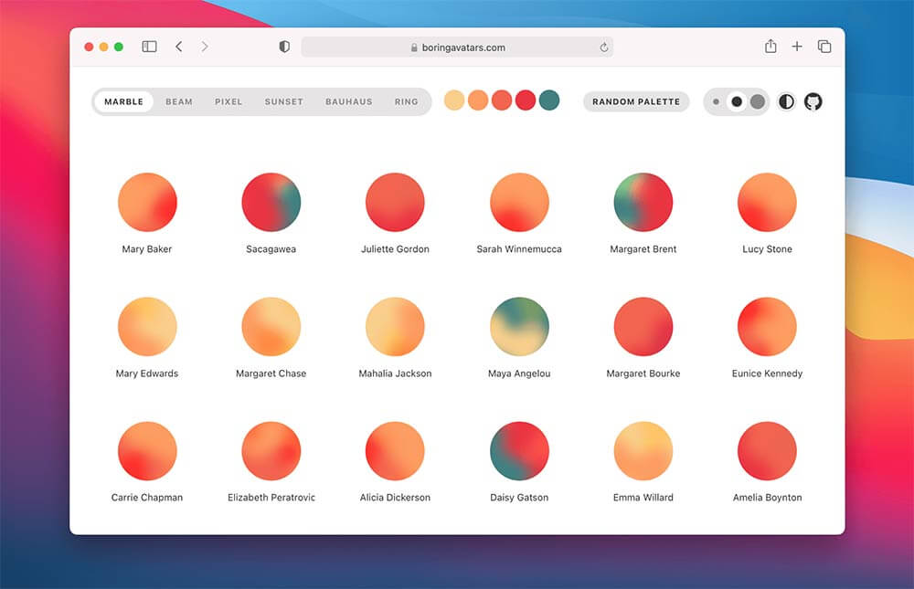 사용자 이름과 선택한 색상으로 임의의 SVG 모양을 자동으로 생성할 수 있는 JavaScript React 라이브러리.