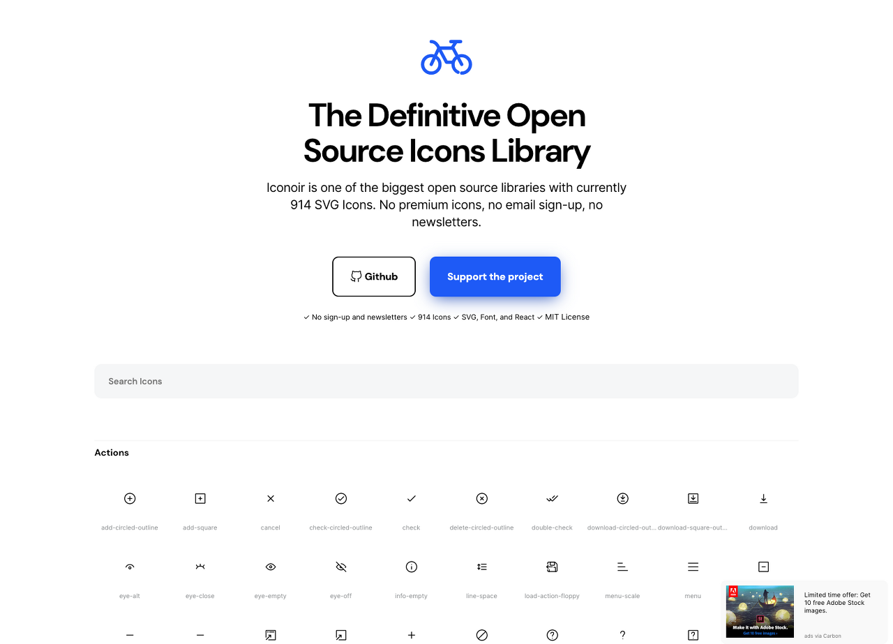 현재 900개 이상의 SVG 아이콘을 갖춘 세계 최대 규모의 오픈 소스 라이브러리. 원하는 아이콘을 클릭하면 바로 다운로드 됩니다. 모든 아이콘은 MIT 라이선스로 소스코드 공개 필요없이 개인용, 상업용 무료로 사용이 가능합니다.
