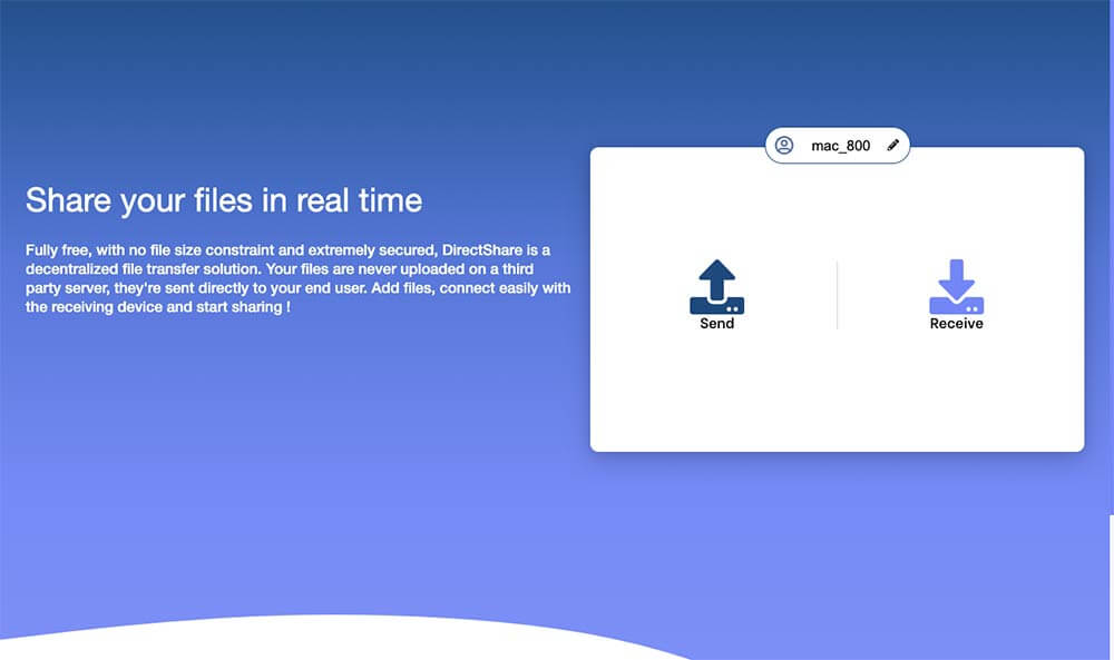 파일 크기의 제한 없이 파일을 전송할 수 있는 무료 온라인 서비스. 파일은 타사 서버에 업로드되는 것은 아니라 최종 사용자에게 직접 전송됩니다.