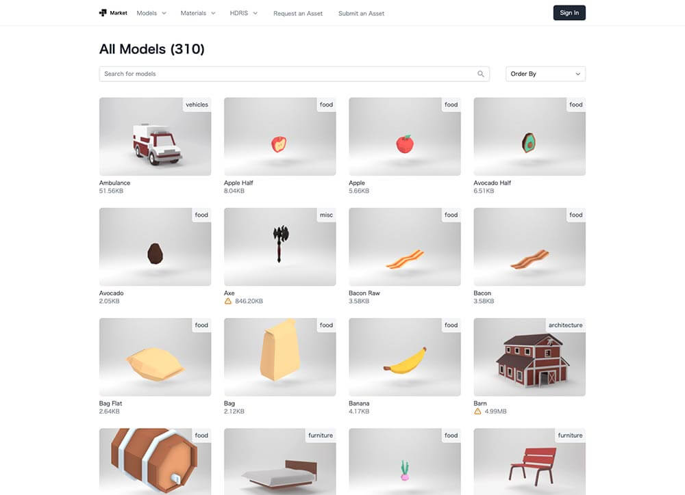저작권 걱정 없는 CC0라이선스로 자유롭게 이용할 수 있는 3D 모델과 텍스처, HDRIS 등을 모은 라이브러리. threejs에서 바로 사용할 수 있는 스타터 소재도 볼 수 있습니다.