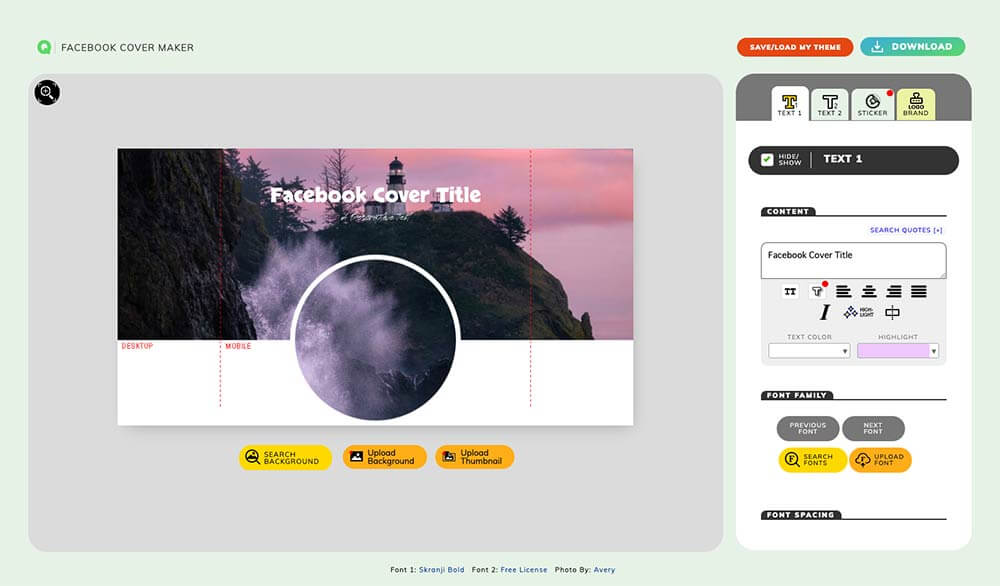 Facebook 커버 사진을 쉽게 만들 수 있는 온라인 도구입니다. 이미지 업로드 및 문자 텍스트 추가, 스티커와 로고의 추가도 가능합니다.