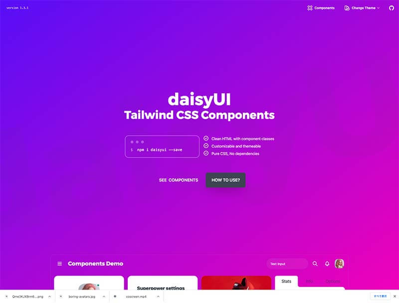 Tailwind CSS 프레임 워크를 지원하는 무료 컴포넌트 사이트입니다. 모든 UI 컴포넌트가 갖추어져 있을 뿐 아니라 우측 상단 버튼으로 라이트, 다크 모드, 레트로 등의 색상 테마를 전환 할 수 있습니다.